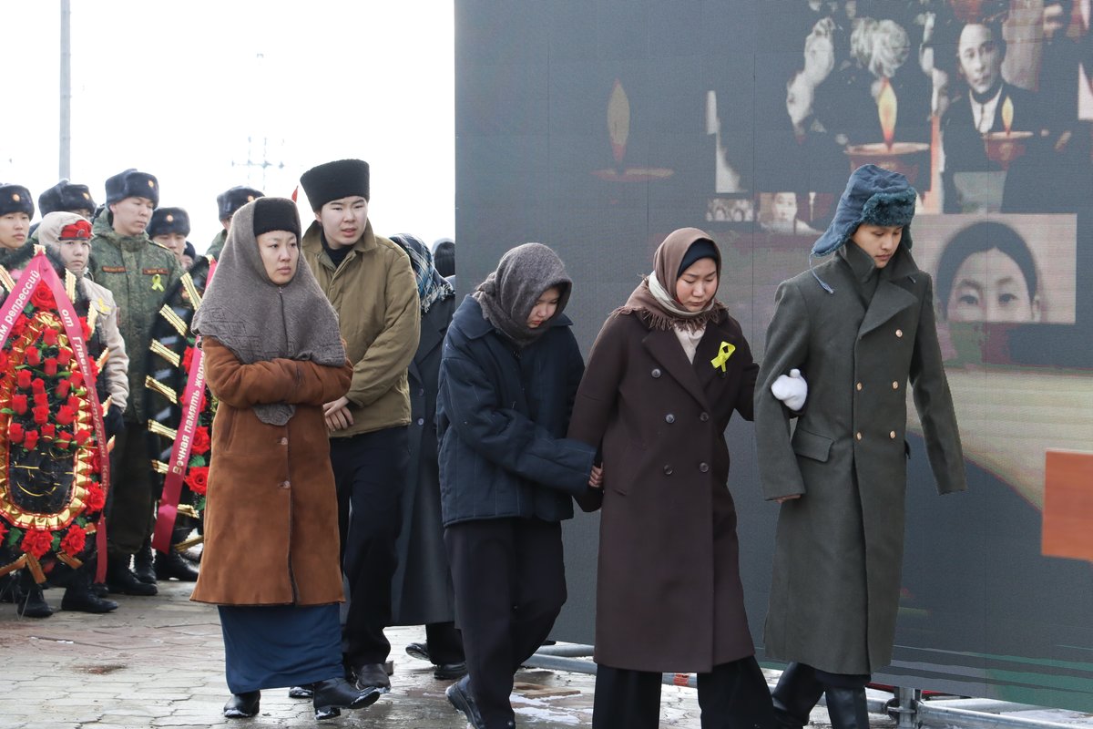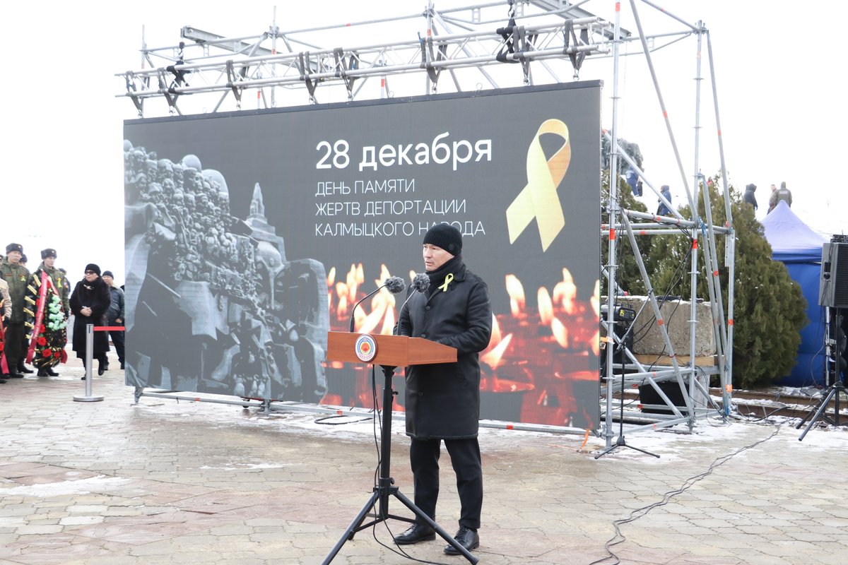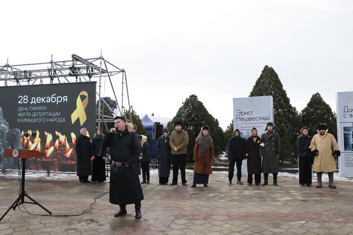 Траурный митинг, посвященный скорбной дате, предварила литературно-музыкальная композиция. В постановке под открытым морозным небом приняли участие артисты трех республиканских театров, солисты Государственного хора им. А. О-Г. Цебекова, народный артист Калмыкии Кутлан Мукубенов.