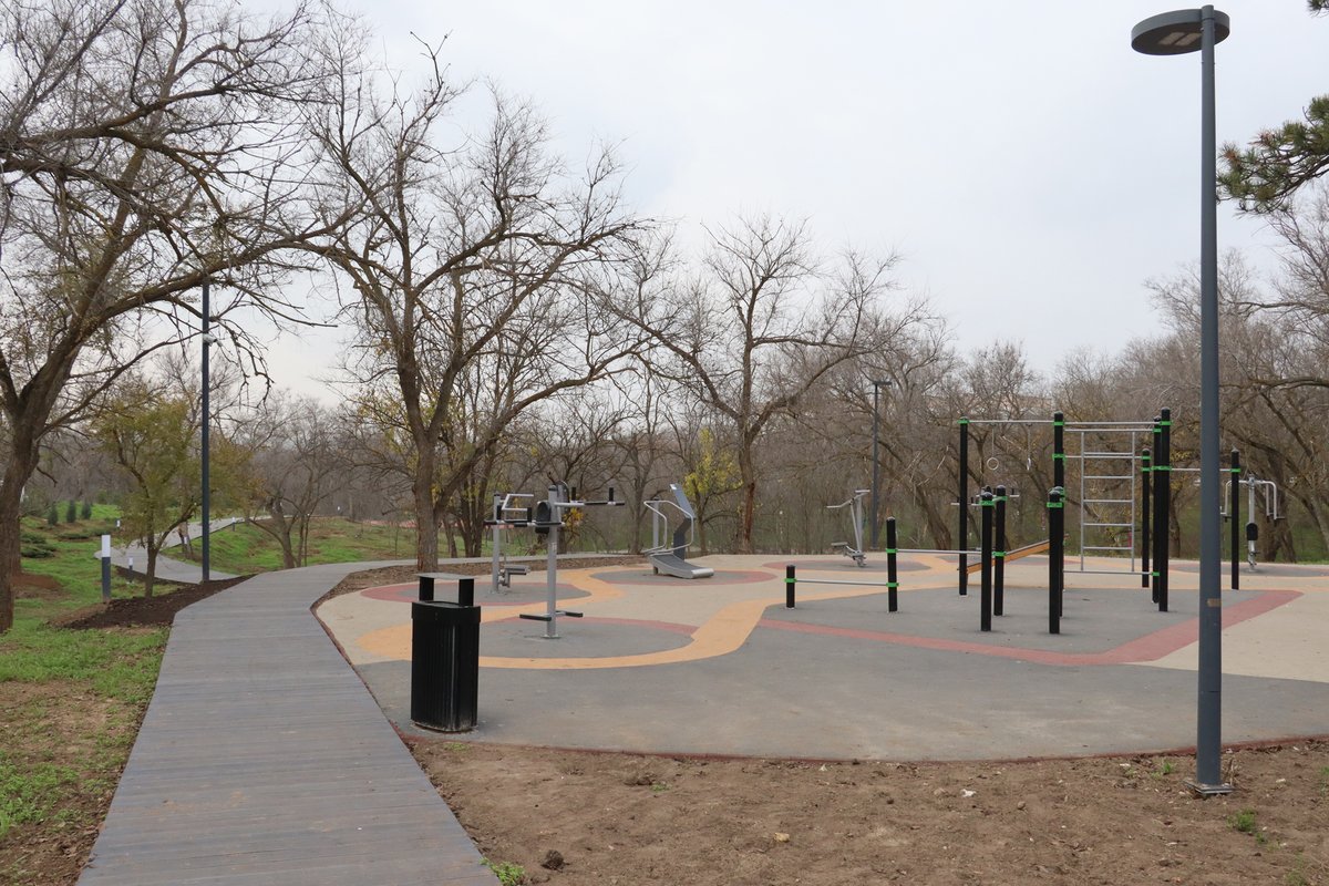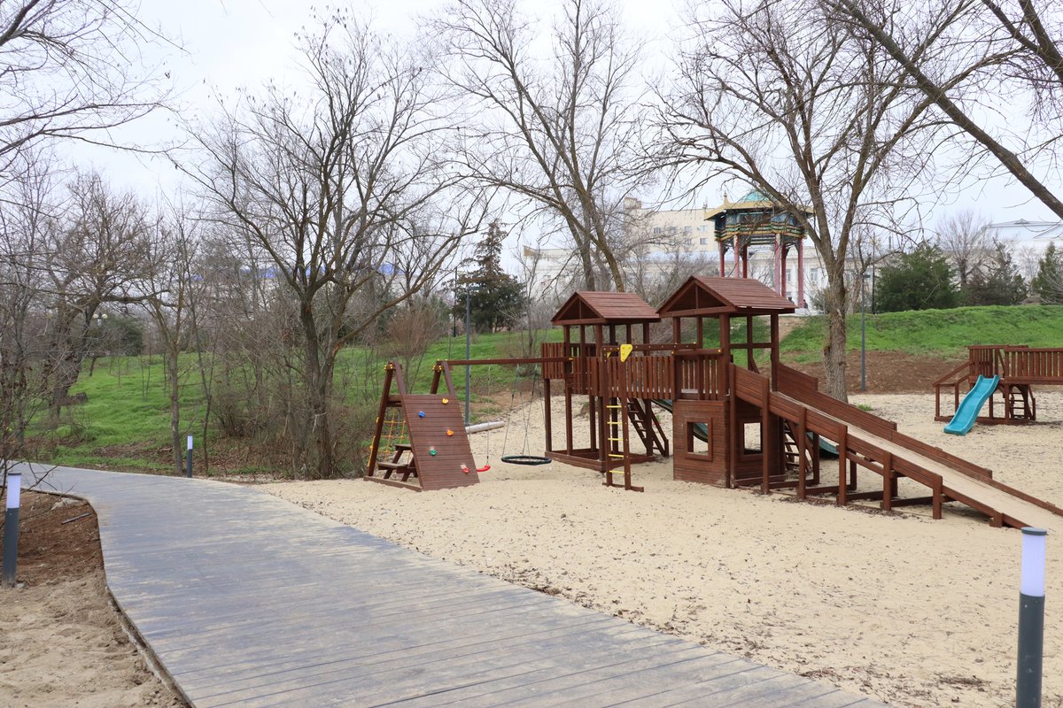 Особенной достопримечательностью на маршруте является детский городок. Он деревянный, что большая редкость для безлесной Калмыкии. Башенки, теремок, горка, сказочные персонажи. Здесь устраивают инсталляции в форме большого светящегося круга, похожего на плавательный, в черном контуре. Отметил два экологических момента. Тропу проложили так, чтобы минимизировать вырубку зеленых насаждений. Во-вторых, на самой улице продумана ливневка – поверхностные воды «убегают» по лоткам в заросли парка «Дружба».